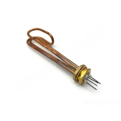 Aquecedor de cobre niquelado com flange e junta de latão, três circuitos, projetado para instalação em caldeira elétrica. O diagrama de conexão encontra-se na tampa protetora do aquecedor.