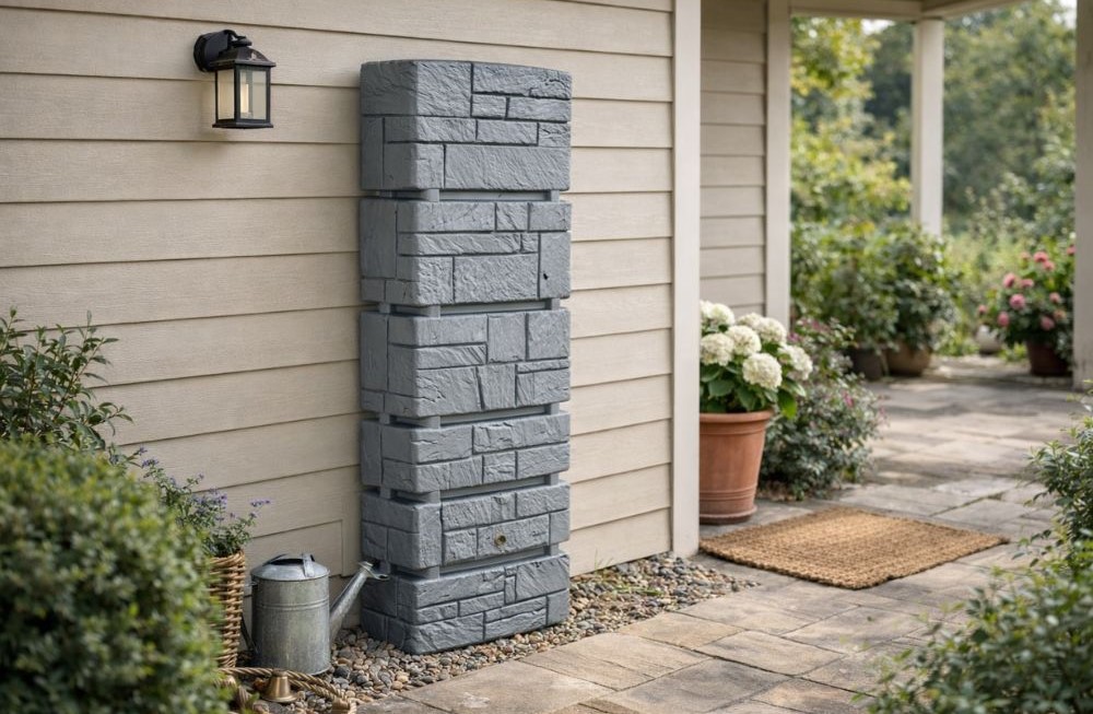 Tower Stone – um elegante reservatório vertical para águas pluviais com aparência de pedra.